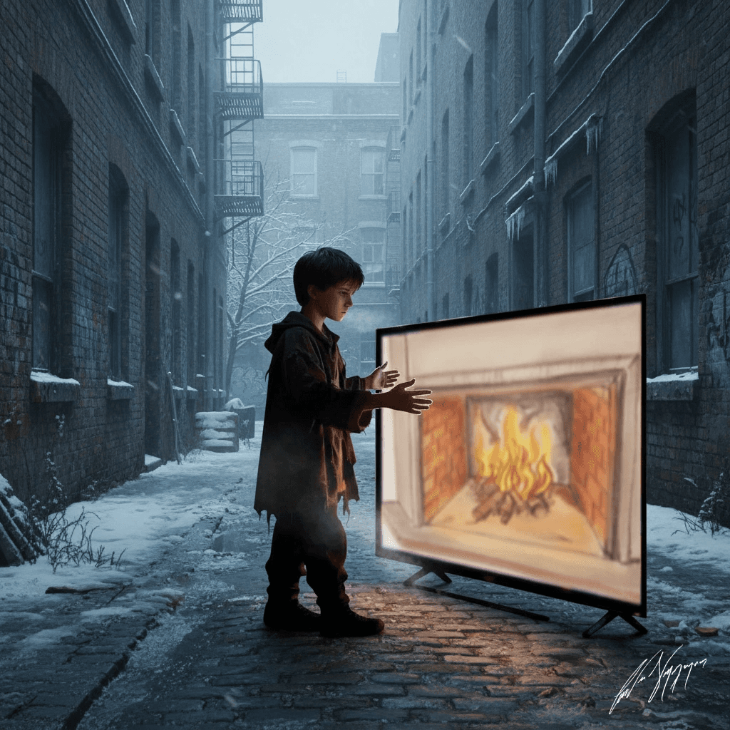 So we sit close to whatever heat is left, even if it comes from a screen and not a fire.
